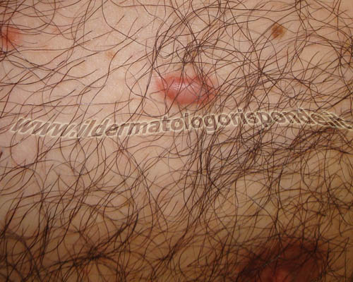 Cheloide post traumatico. Sono visibili i caratteristici pseudopodi a chele di granchio (in basso)